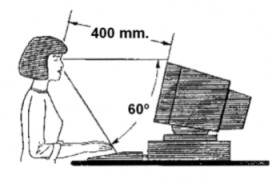 Para las tareas habituales la distancia de visión, no debe ser nunca menor a 400 mm. Por otro lado, debe ser factible orientar la pantalla de manera que las áreas vistas habitualmente puedan serlo bajo ángulos comprendidos entre la línea de visión horizontal y la trazada a 60º bajo la horizontal.